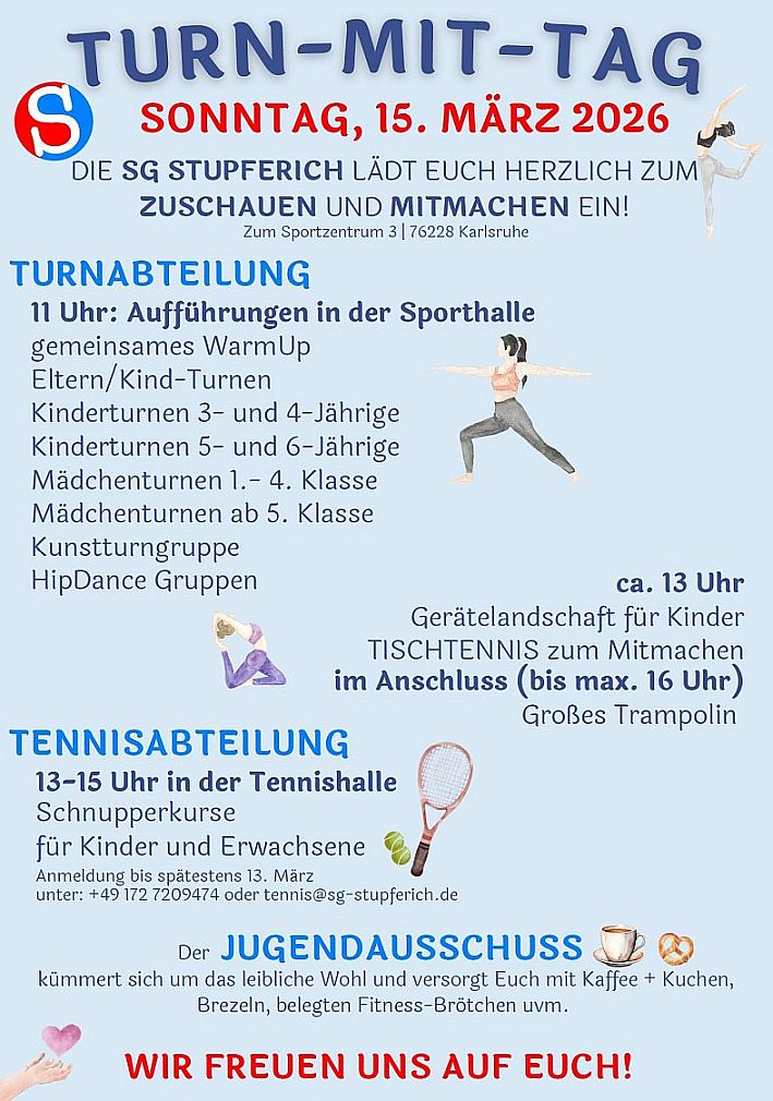 | So., 15.03 | 13-15:00 Uhr | Turn-mit-Tag mit Schnuppertennis/Tennishalle/Info Anmeldung 0172 7209474 |