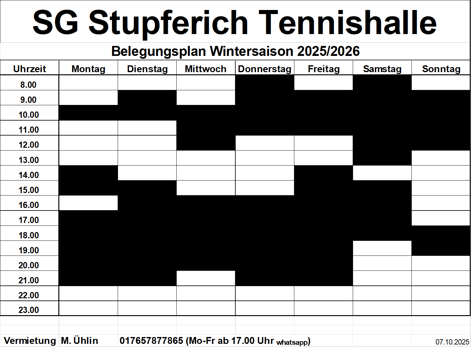 Die Halle ist gut belegt, jedoch gibt es noch freie Stunden zu weniger couranten Zeiten. Den aktuellen Belegungsplan findet man untenstehend. |