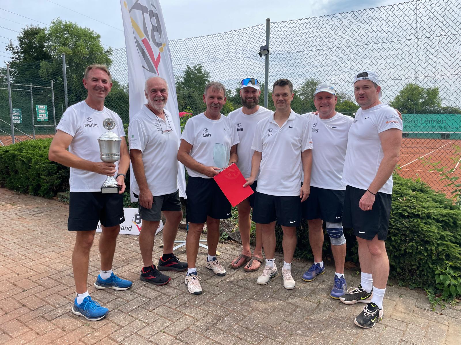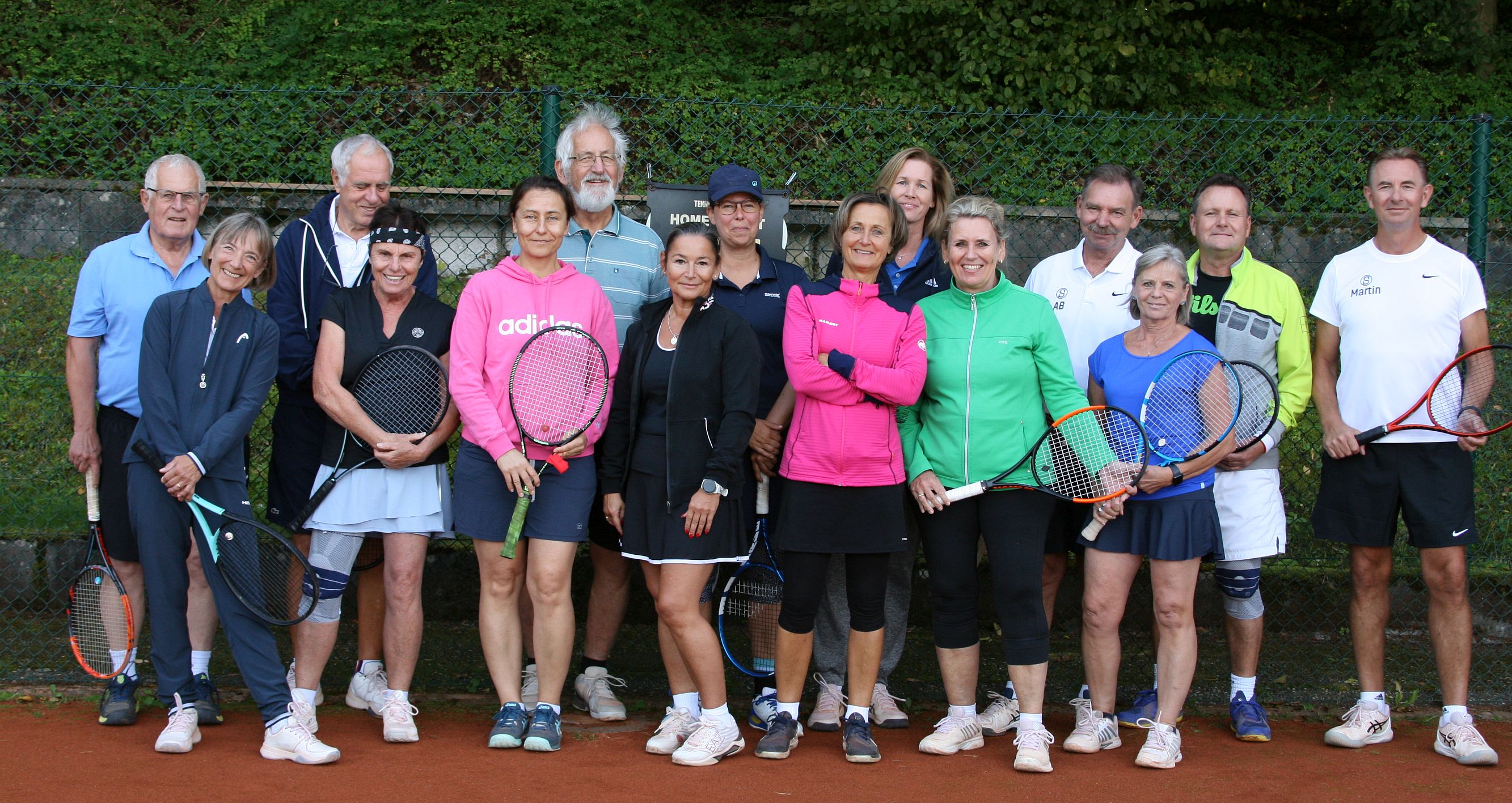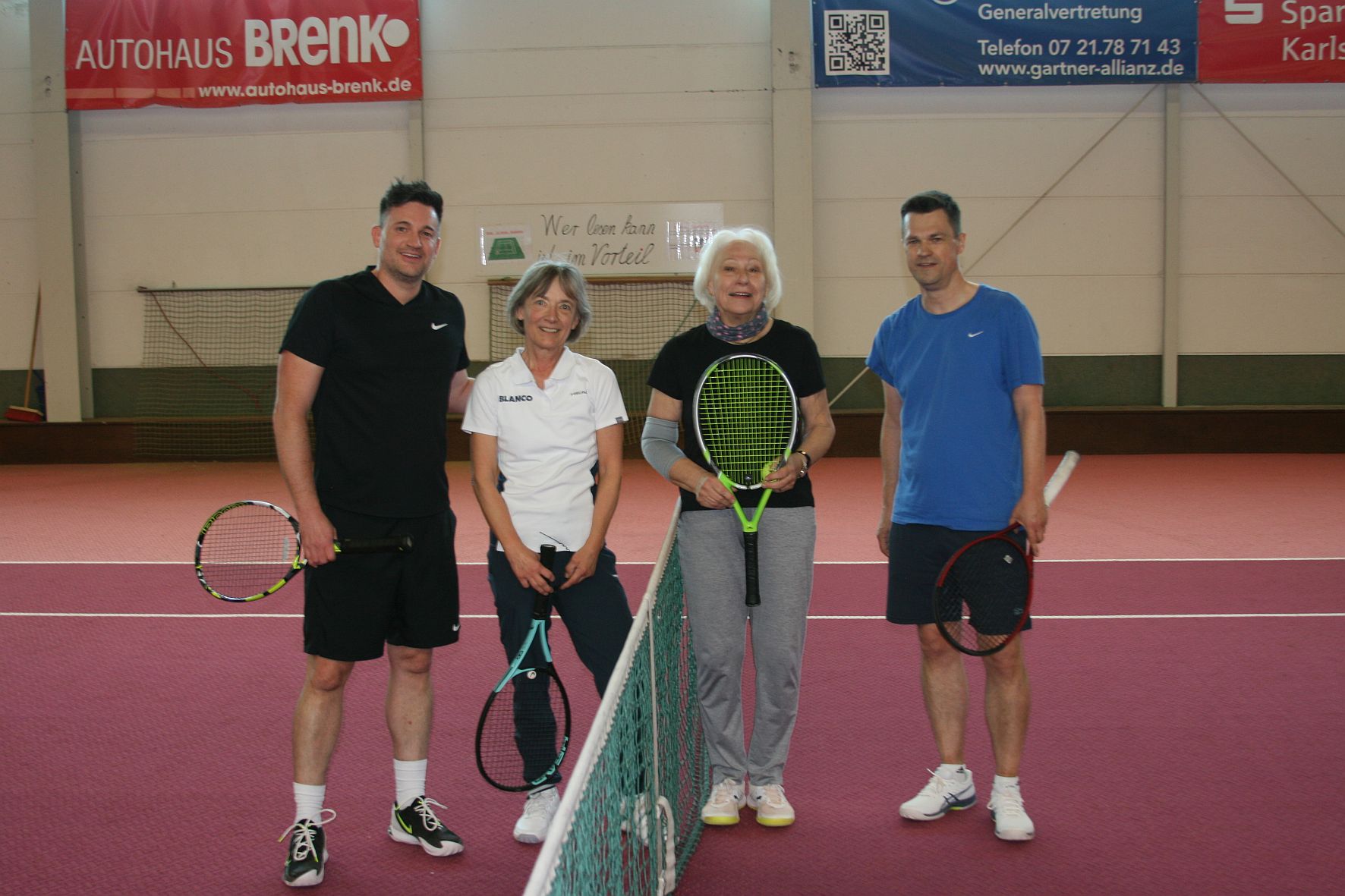 Am Sonntag kamen sechs Karlsruher Prominente zu uns für ein entspanntes Mixed Turnier. Fünf tennisspielende Richter/-innen und Anwälte aus Karlsruhe, der Stadt des Rechts, sowie ein Ex-Profifußballer der KSC ergänzt mit Martin Neumann bildeten eine Mannschaft, die zusammen mit unseren Aktiven jeweils ein Mixedpaar bildeten. Wegen kurzfristiger Absage eines Teilnehmers wurde Manfred Dichtl vom TC Eurasburg in Bayern gebeten als Gast teilzunehmen. Ergänzt wurde das Feld dankenswerterweise durch Walter Kritikos und unsere Damenmannschaft. Nachdem Helga kurzfristig absagen musste war Uschi Müller bereit, in ihrer alten Riege mitzuspielen.